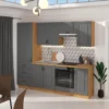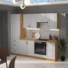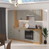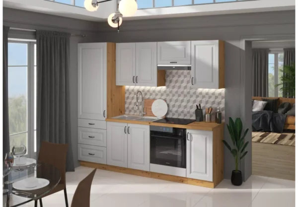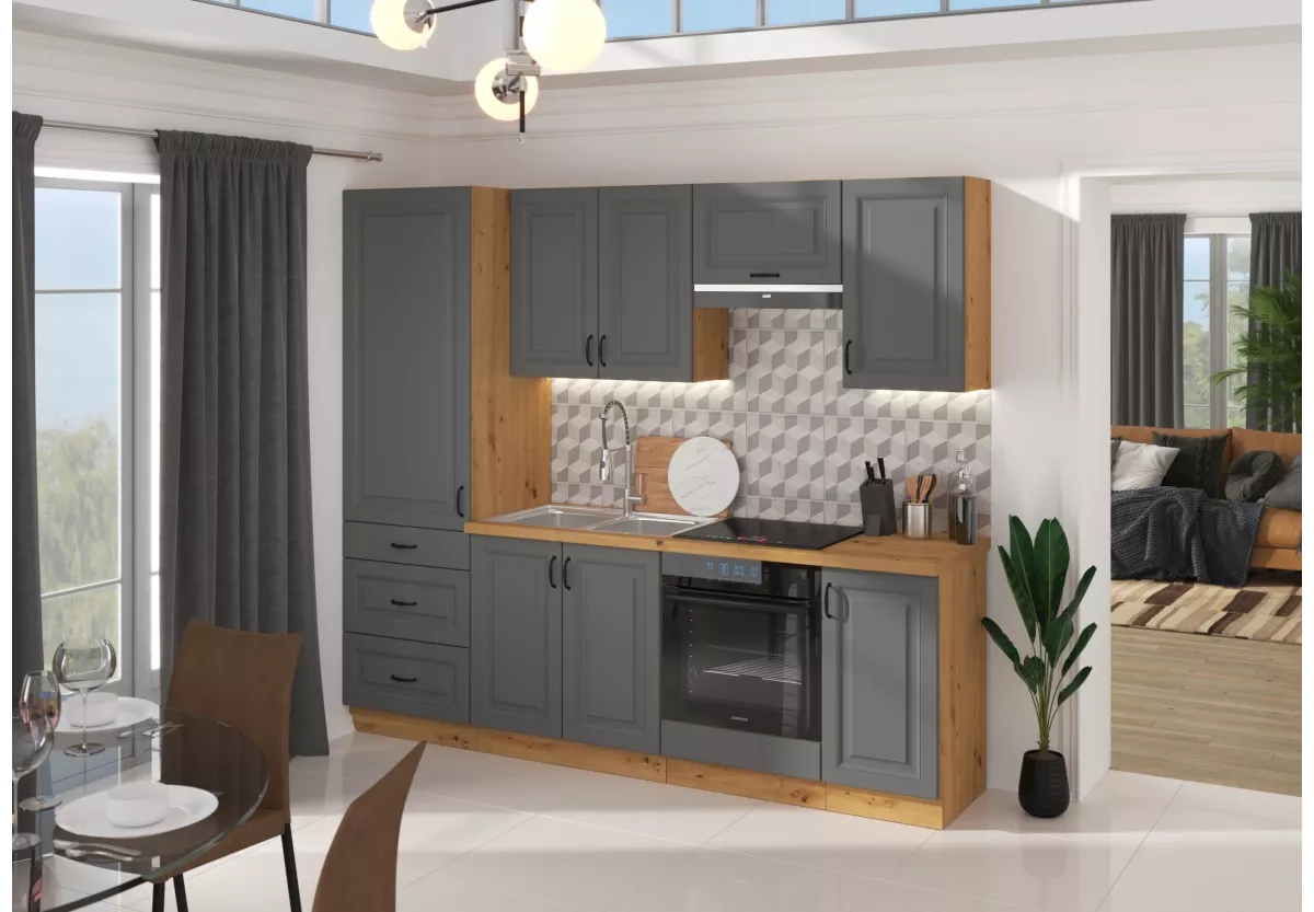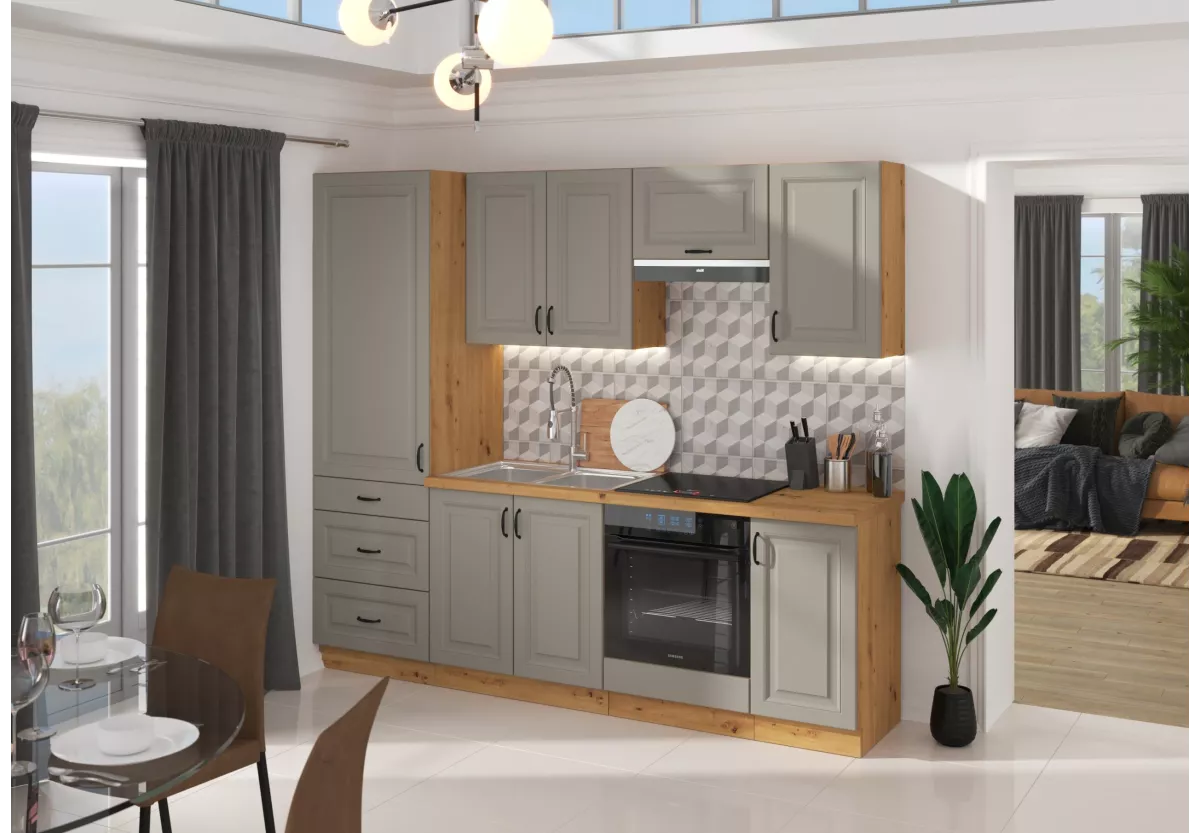 Tilos V to funkcjonalny zestaw mebli kuchennych, który łączy minimalistyczny styl z praktycznymi rozwiązaniami ułatwiającymi codzienne gotowanie. Stonowana kolorystyka, eleganckie metalowe uchwyty oraz przemyślany układ brył sprawiają, że kuchnia zyskuje nowoczesny, a jednocześnie ponadczasowy charakter.