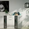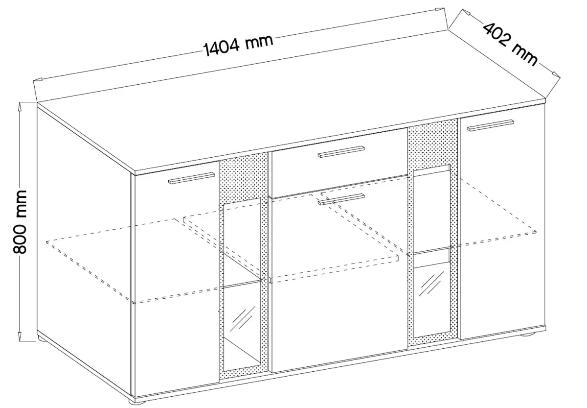 Przeszklone fronty w bocznych częściach komody dodają bryle lekkości i nowoczesnego wyrazu. Dodatkowym atutem jest możliwość zastosowania opcjonalnego oświetlenia LED w kolorze niebieskim, które: