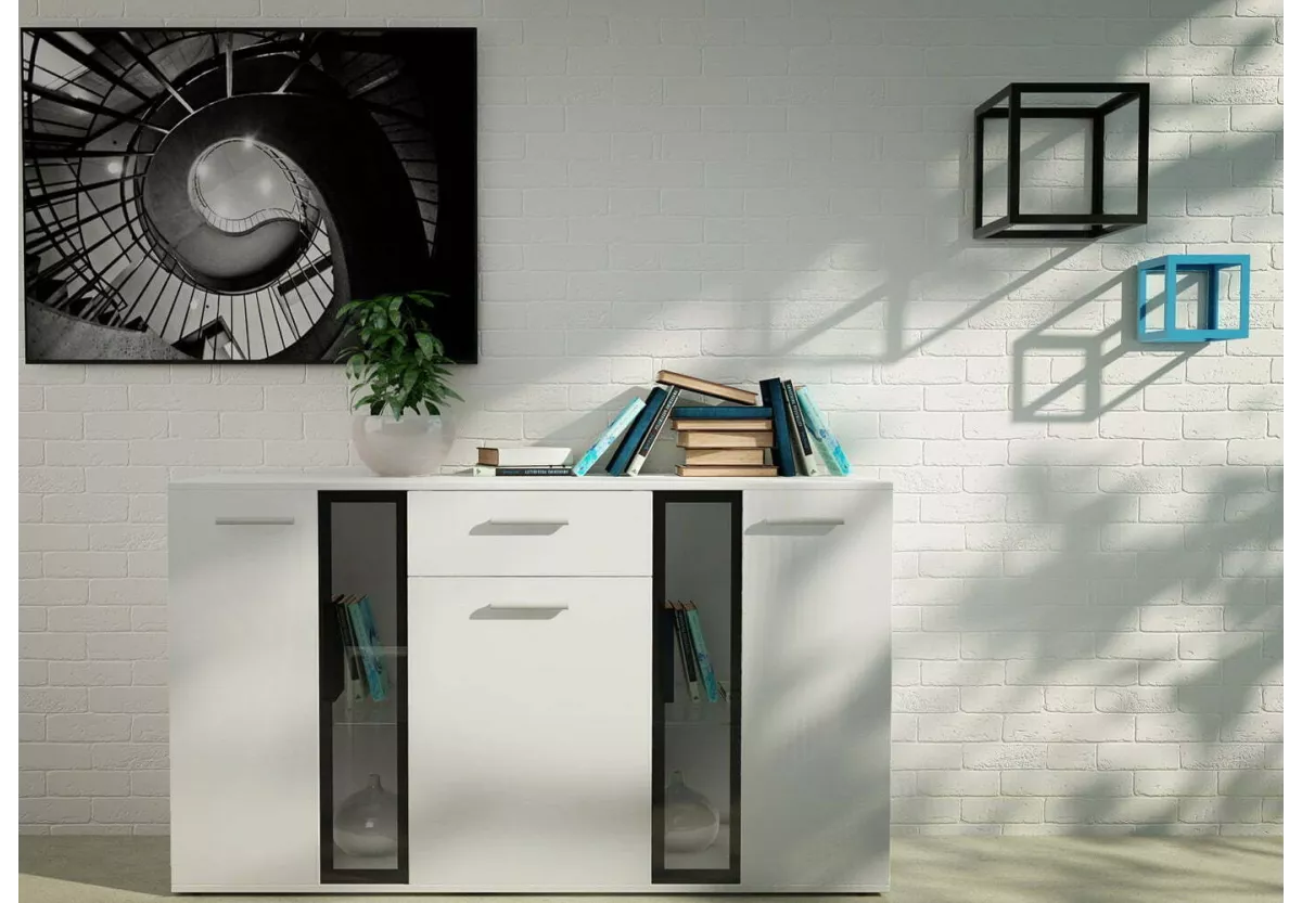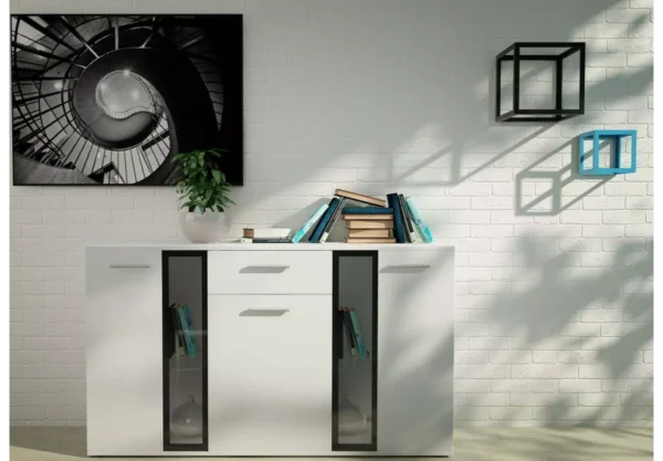 Komoda SALOR w jednolitej kolorystyce białej z przeszkleniami to doskonały wybór do wnętrz, w których liczy się lekkość, świeżość i uniwersalny styl. Biała bryła optycznie rozjaśnia przestrzeń, nadając jej nowoczesnego, a zarazem eleganckiego charakteru. To mebel, który doskonale odnajdzie się zarówno w klasycznych aranżacjach, jak i we wnętrzach nowoczesnych czy minimalistycznych.