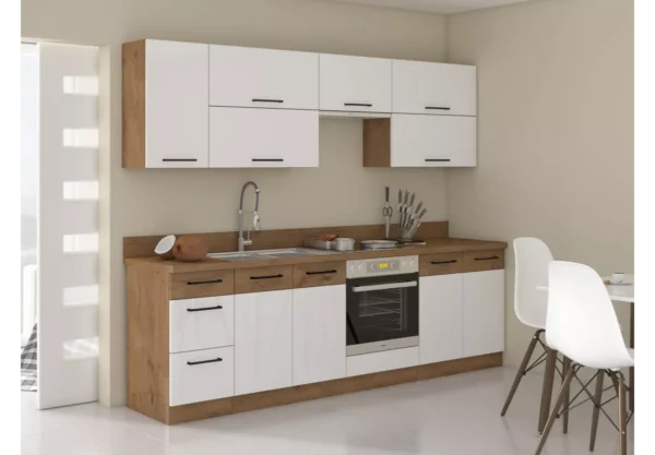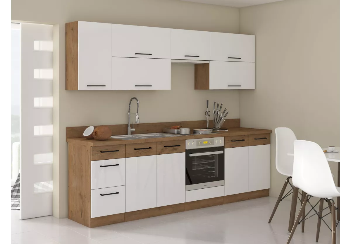 Meble kuchenne Anafi VI to propozycja dla osób, które oczekują harmonijnego połączenia estetyki i funkcjonalności. Białe fronty w połysku nadają wnętrzu lekkości i świeżości, a solidna konstrukcja gwarantuje trwałość na lata. To zestaw, który doskonale odnajdzie się zarówno w nowoczesnych, jak i bardziej klasycznych aranżacjach.