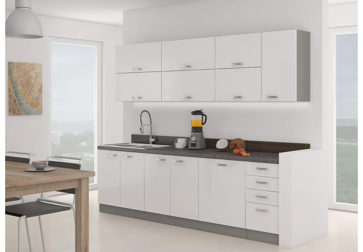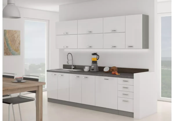 Zestaw mebli kuchennych Nancy II to idealne połączenie nowoczesnego designu, funkcjonalności i estetyki. Fronty w białym połysku pięknie odbijają światło, optycznie powiększając przestrzeń i nadając kuchni lekkości oraz elegancji. To propozycja dla osób, które cenią stylowe wnętrza i komfort codziennego użytkowania.