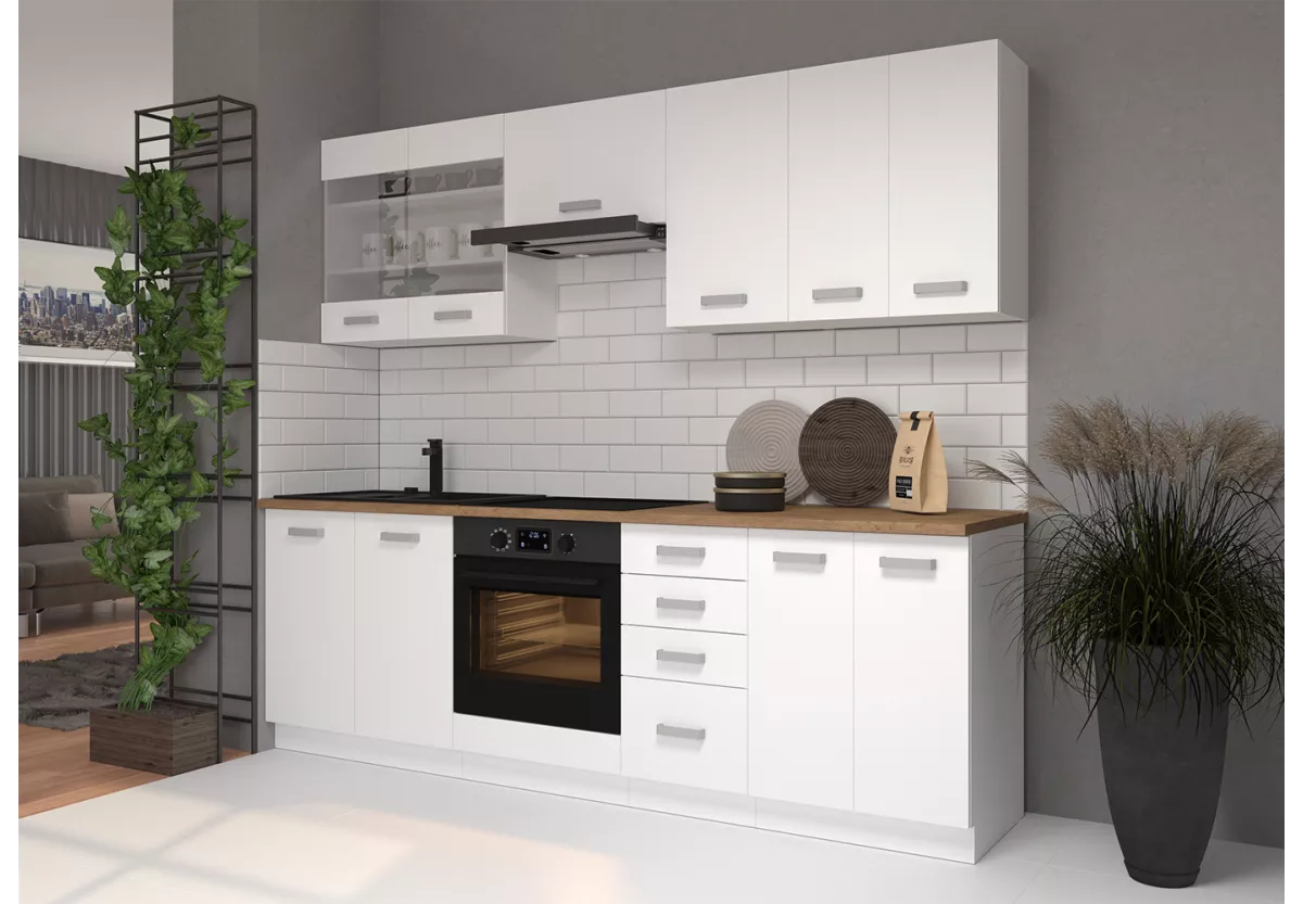 Zestaw mebli kuchennych Nina V to propozycja dla osób, które cenią połączenie nowoczesnej estetyki z funkcjonalnymi rozwiązaniami. Inspirowany stylem skandynawskim design, jasna kolorystyka oraz przemyślany układ szafek sprawiają, że kuchnia staje się przestrzenią wygodną, elegancką i ponadczasową.