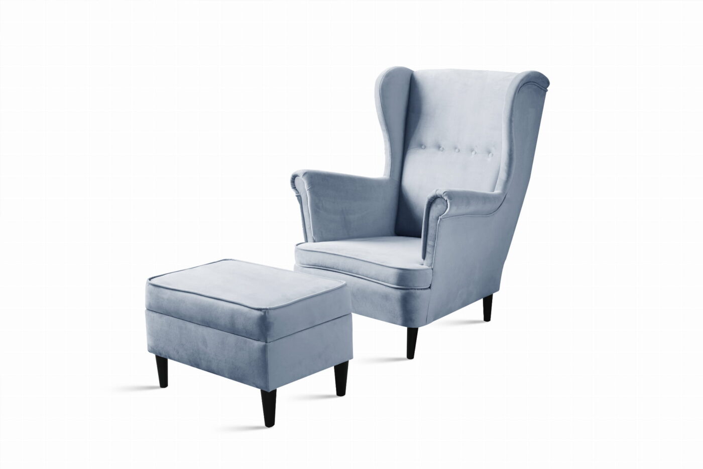 Fotel można zamówić w zestawie z otwieranym podnóżkiem o wymiarach 44×44 cm, wysokim na równo z siedziskiem fotela.