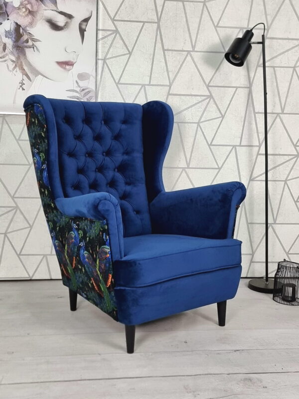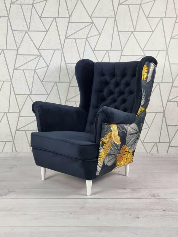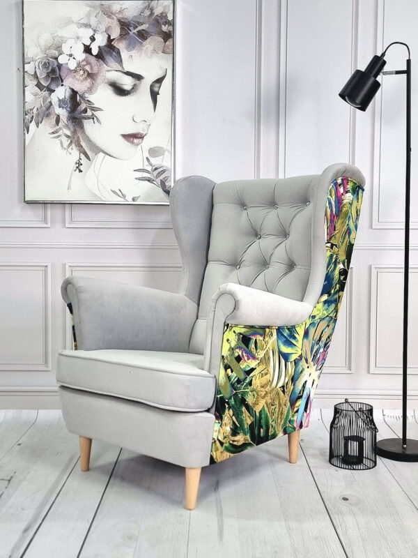 Istnieje również możliwość wykonania wersji dwukolorowej – tył fotela może zostać obity tkaniną z bogatej oferty wzorów, natomiast przód w dowolnej tkaninie dostępnej w naszej kolekcji.