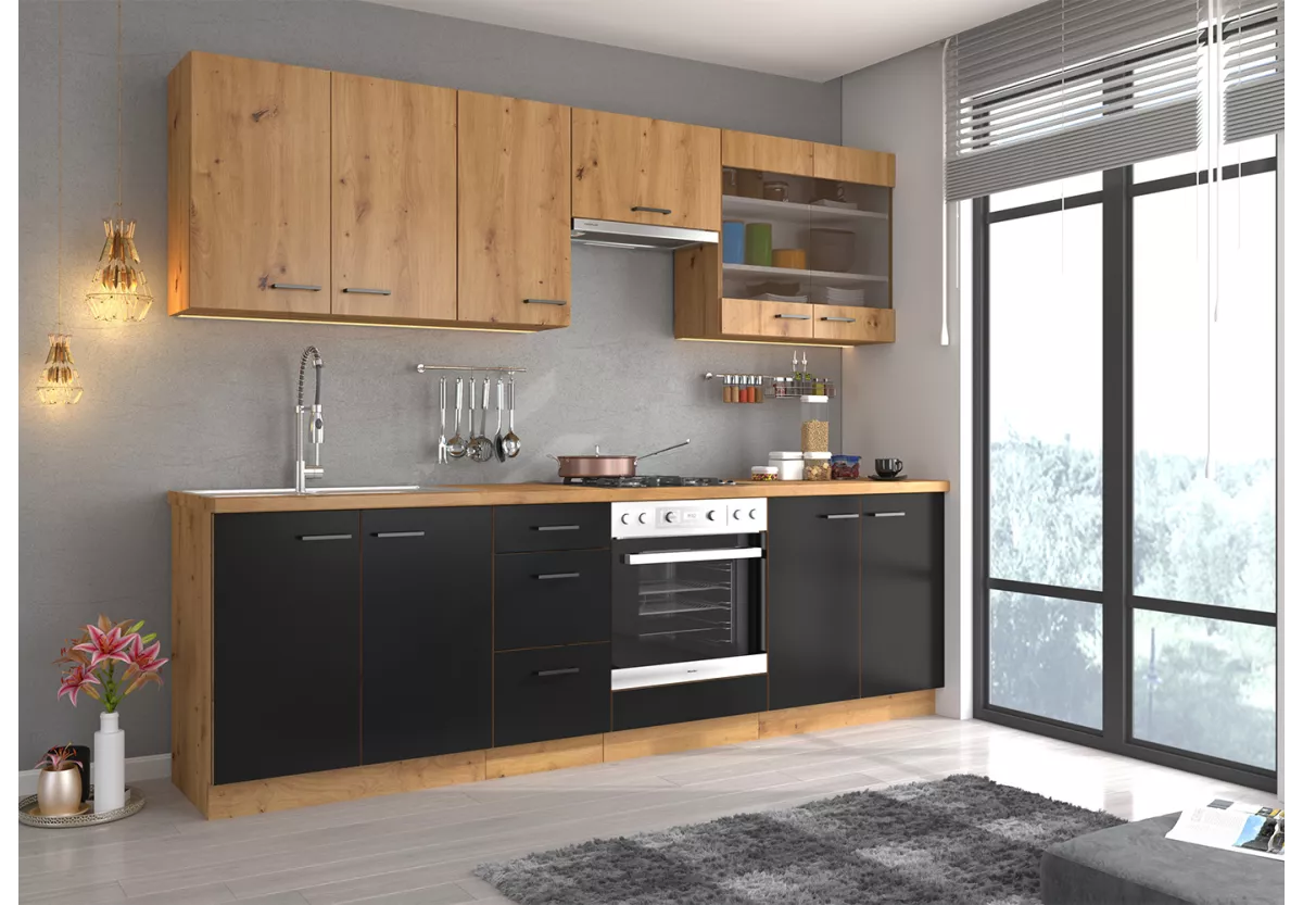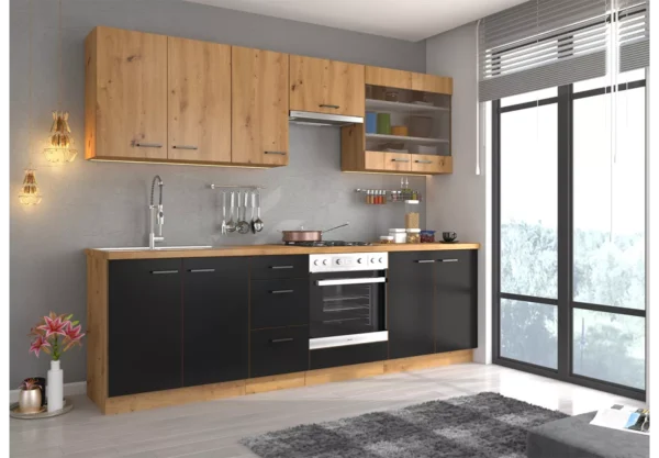 Zestaw mebli kuchennych Namet VI to funkcjonalna i estetyczna propozycja dla osób, które oczekują solidnego wykonania oraz wygody codziennego użytkowania. Przemyślany układ szafek stojących i wiszących pozwala stworzyć spójną, ergonomiczną przestrzeń kuchenną, idealną do gotowania i przechowywania.