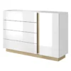 Komoda dostępna jest w kilku wariantach kolorystycznych, co umożliwia łatwe dopasowanie jej do wystroju wnętrza. Prosta forma, nowoczesne uchwyty oraz subtelne nóżki z tworzywa sztucznego nadają bryle lekkości i ponadczasowego charakteru.