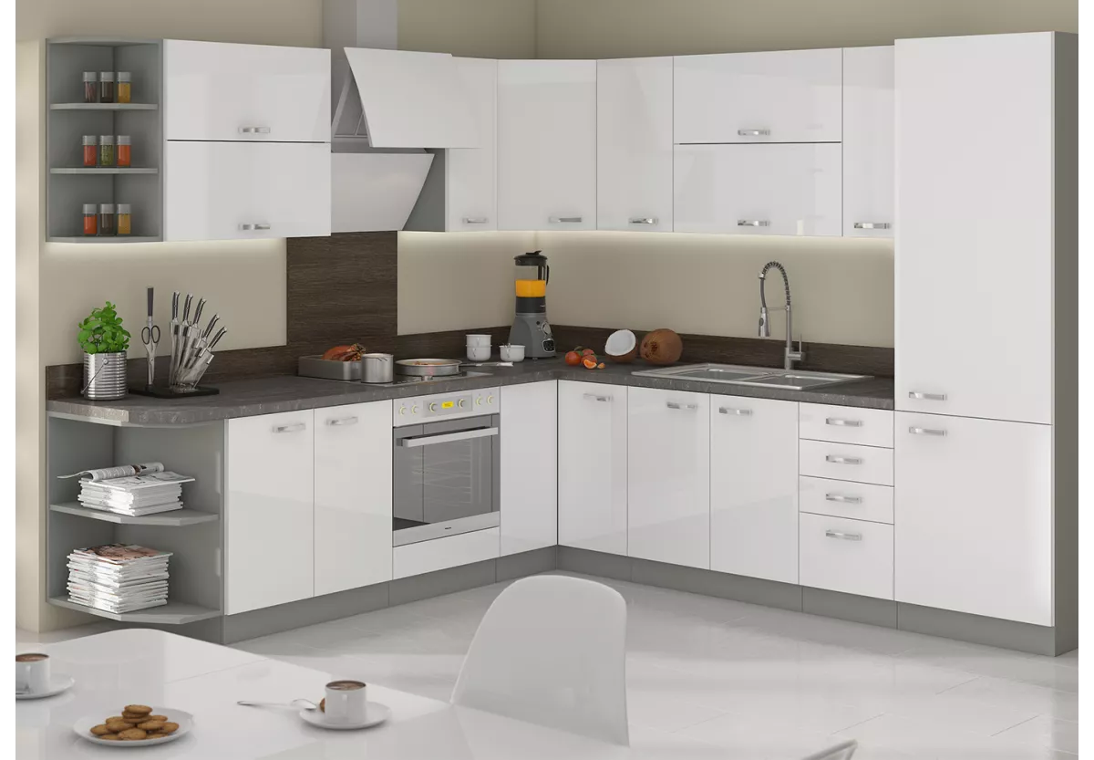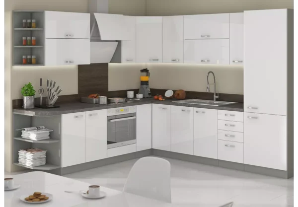 Zestaw mebli kuchennych Nancy III to rozbudowana i kompleksowa propozycja dla osób, które oczekują od kuchni zarówno nowoczesnego wyglądu, jak i maksymalnej funkcjonalności. Przemyślany układ szafek, eleganckie fronty w połysku oraz komfortowe systemy użytkowe sprawiają, że kuchnia staje się wygodnym i estetycznym sercem domu.