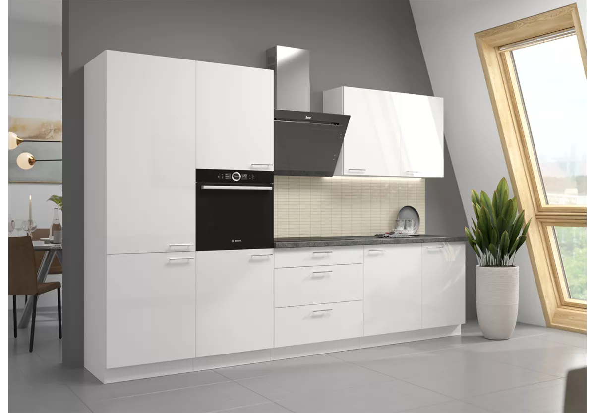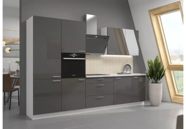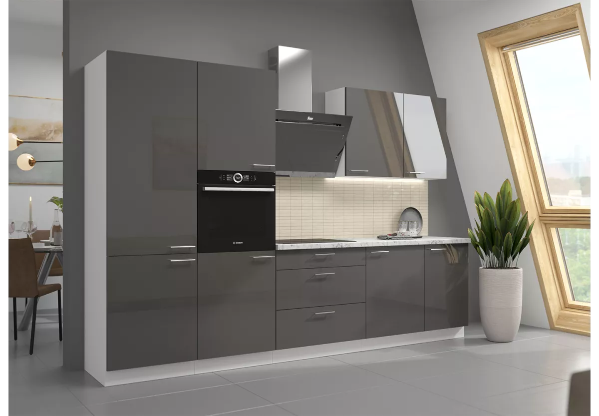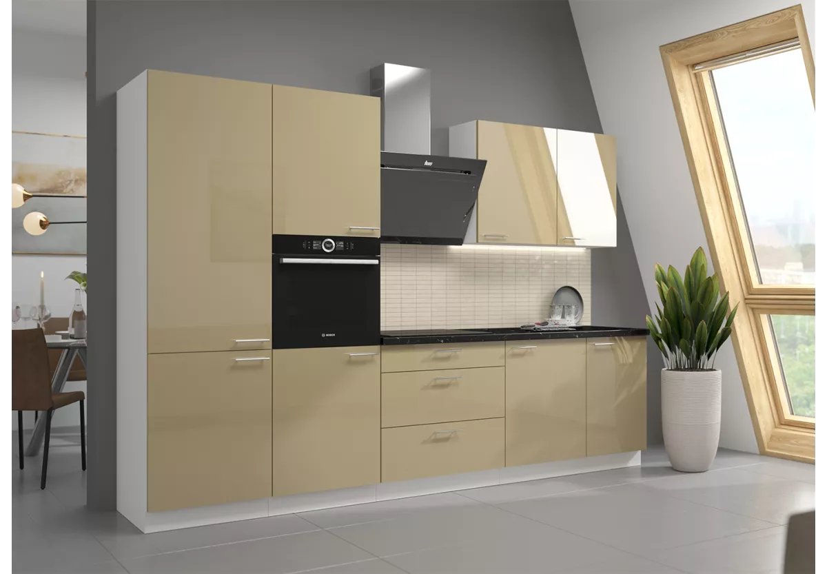 Zestaw mebli kuchennych Nicea III to propozycja dla osób poszukujących eleganckiej, nowoczesnej kuchni z wyraźnym akcentem luksusu. Starannie dobrane materiały, wysoki połysk frontów oraz przemyślany układ szafek sprawiają, że kuchnia staje się reprezentacyjną i w pełni funkcjonalną przestrzenią.