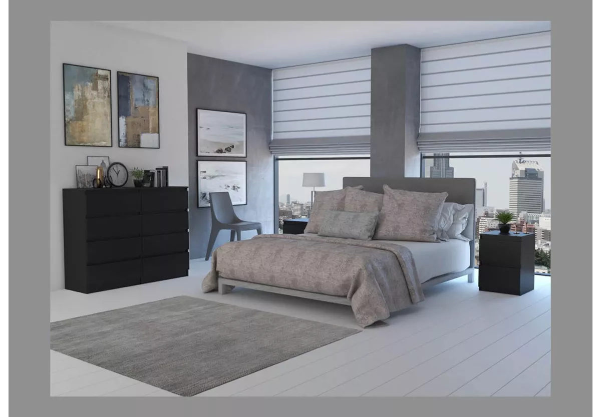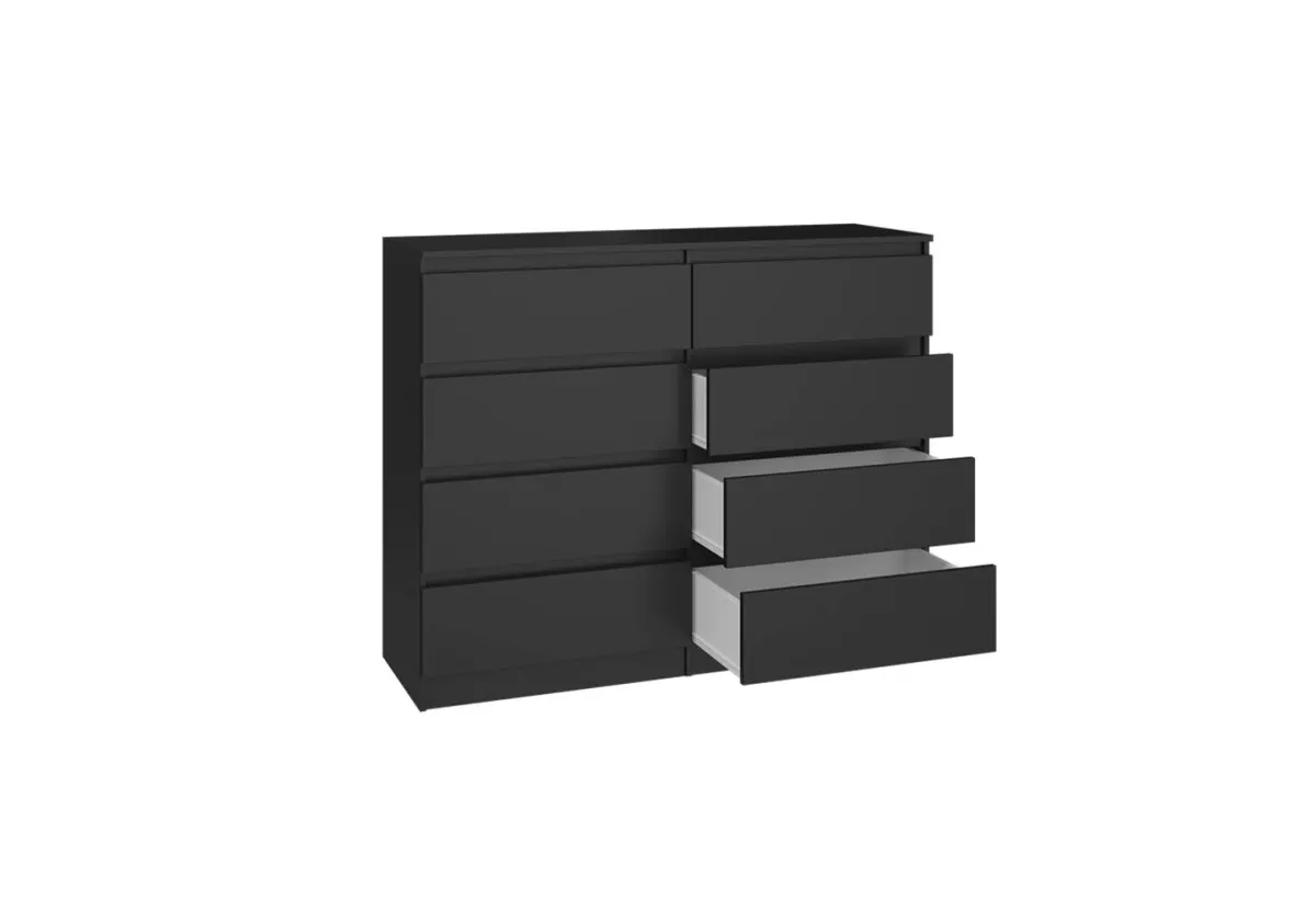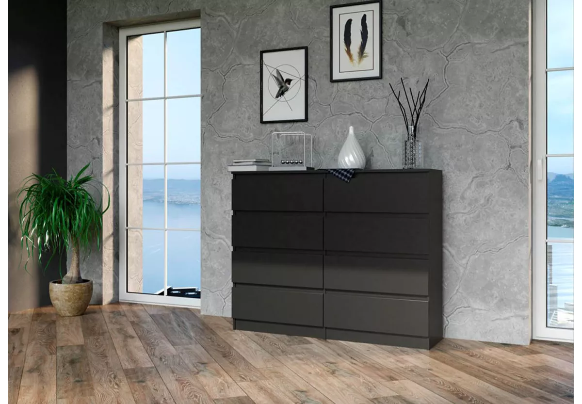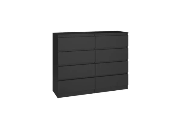 Komoda MALWA 120 to praktyczny i estetyczny mebel, który doskonale sprawdzi się w sypialni, salonie oraz pokoju dziecka. Dzięki ośmiu pojemnym szufladom zapewnia dużą przestrzeń do przechowywania, jednocześnie zachowując kompaktowe wymiary, które łatwo dopasować do różnych wnętrz.