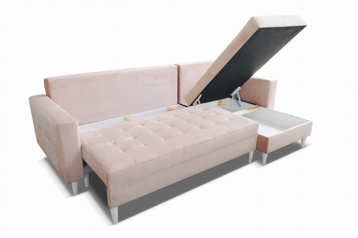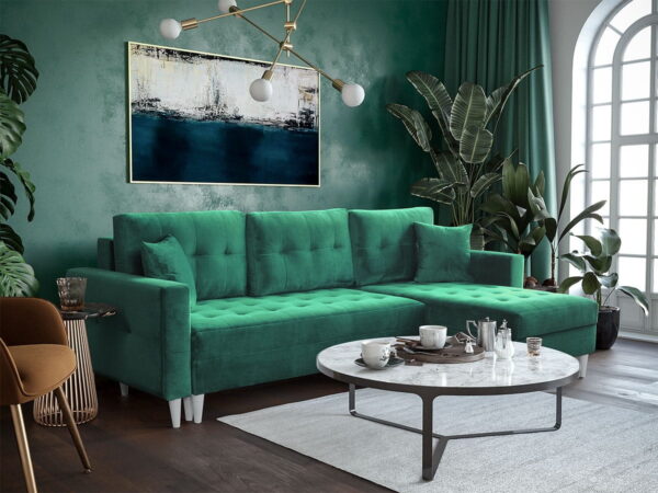 • Pojemniki: narożnik posiada dwa pojemne schowki na pościel, otwierane z pomocą automatu, co ułatwia codzienne użytkowanie.