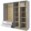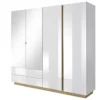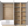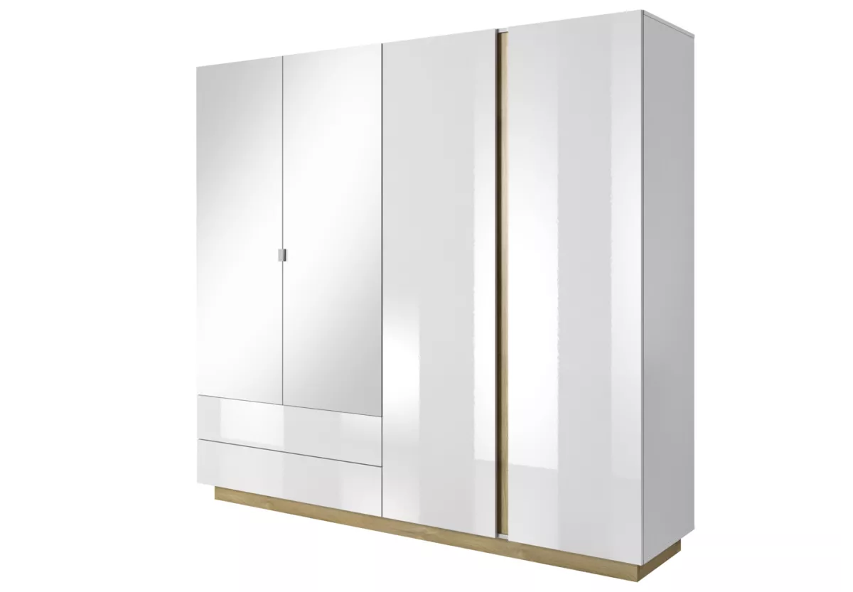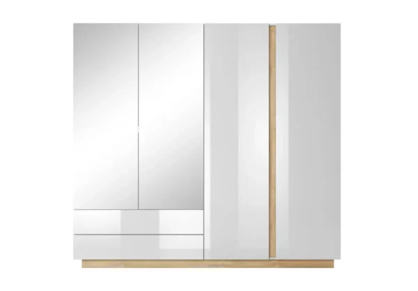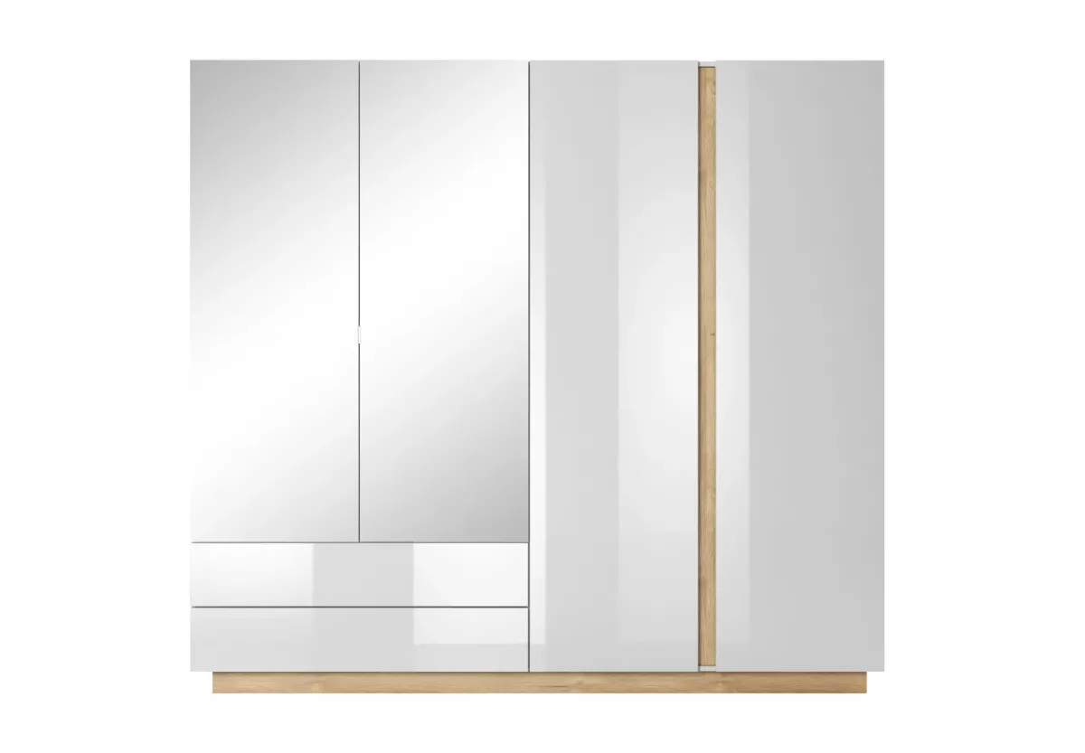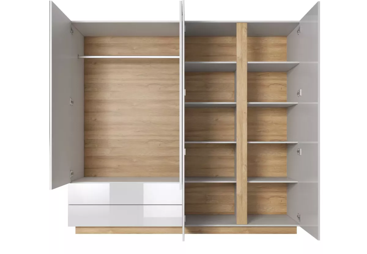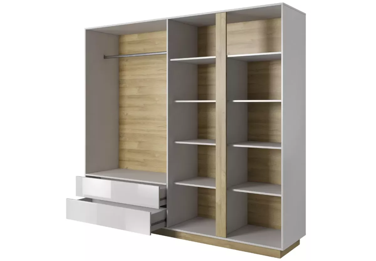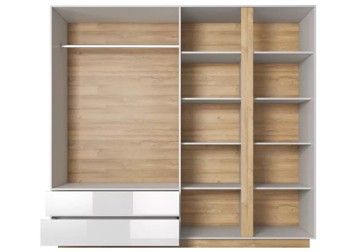 Szafa ARIKO 220 w wersji Biały / Biały połysk / Dąb Grandson to eleganckie połączenie nowoczesnego designu z ciepłym, naturalnym akcentem drewna. Fronty w białym połysku odbijają światło, optycznie rozjaśniając i powiększając wnętrze, natomiast dekor Dąb Grandson wprowadza przytulność i równowagę wizualną.