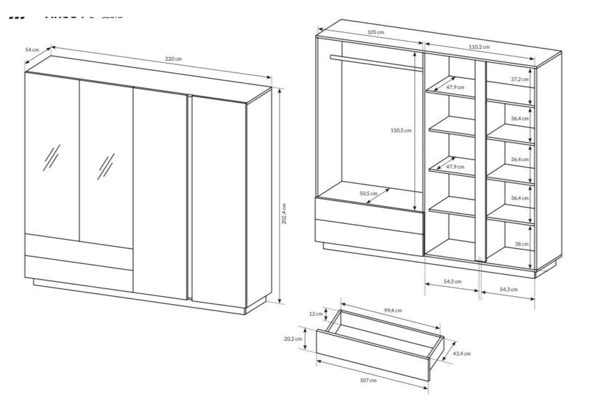 Dzięki szerokości 220 cm, wysokości 202,4 cm i głębokości 54 cm, szafa ARIKO 220 doskonale sprawdzi się jako główny mebel do przechowywania w sypialni, garderobie lub przestronnym przedpokoju, oferując dużą pojemność bez utraty estetyki.