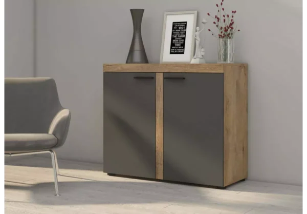 Komoda RUMB I to funkcjonalny i estetyczny mebel, który doskonale odnajdzie się w salonie, sypialni, biurze lub pokoju młodzieżowym. Dwukolorowe zestawienie grafitowych frontów z korpusem w odcieniu dąb lefkas nadaje bryle nowoczesnego charakteru, jednocześnie zachowując ponadczasową elegancję. To propozycja dla osób ceniących prostotę formy i praktyczne rozwiązania.