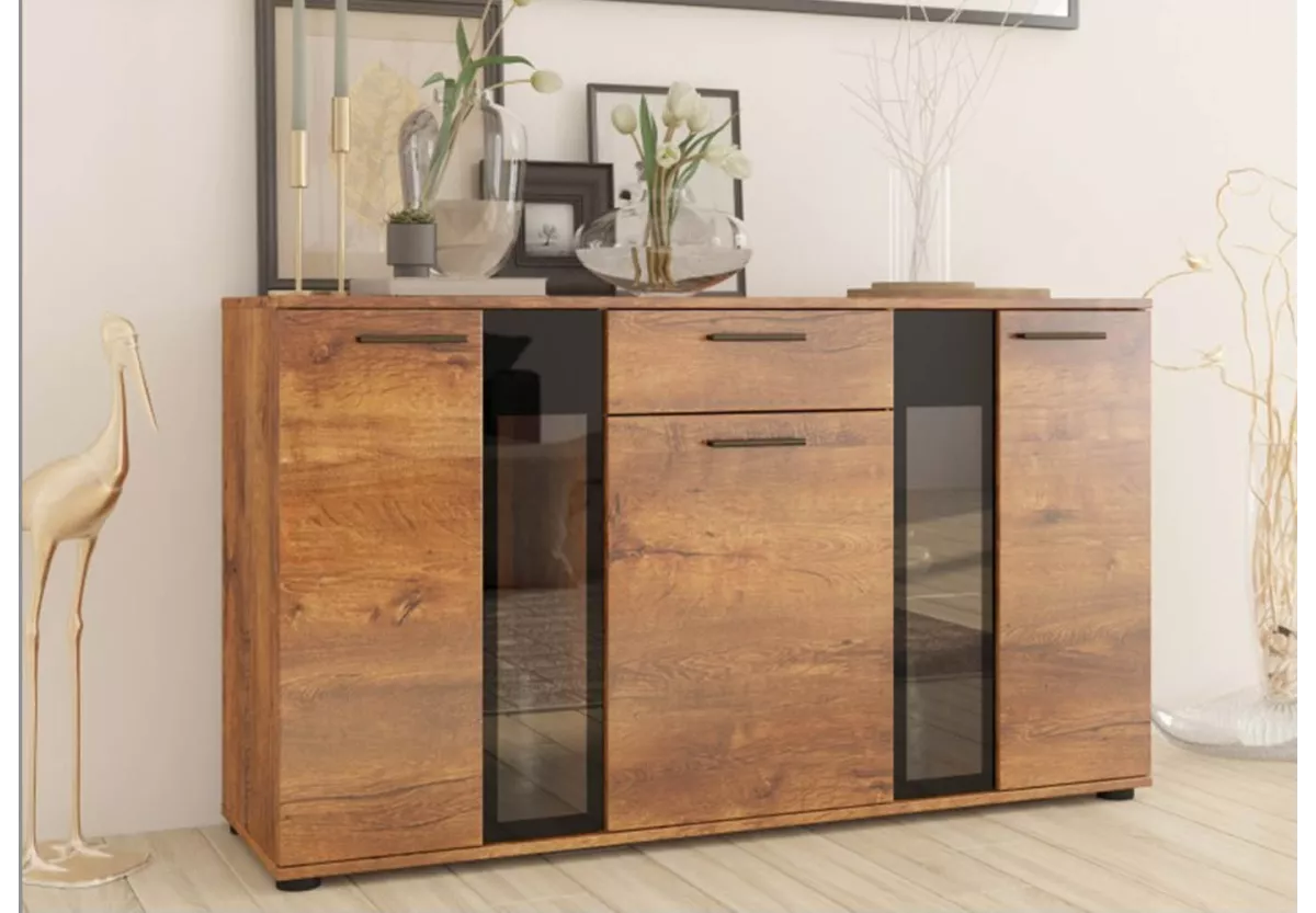 Połączenie naturalnego dekoru drewna z przeszkleniami sprawia, że komoda doskonale pasuje zarówno do wnętrz klasycznych, jak i nowoczesnych.