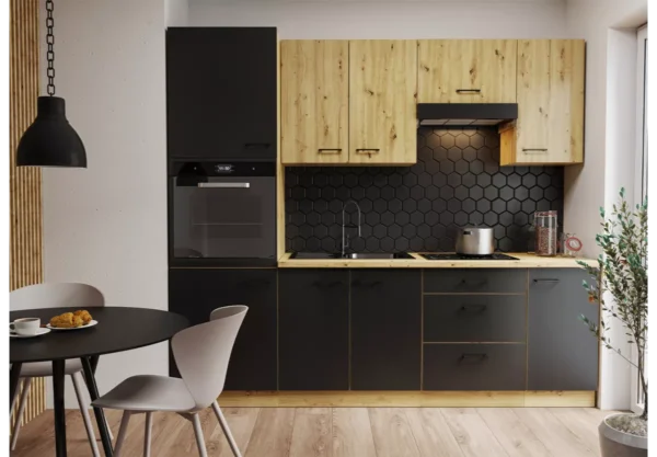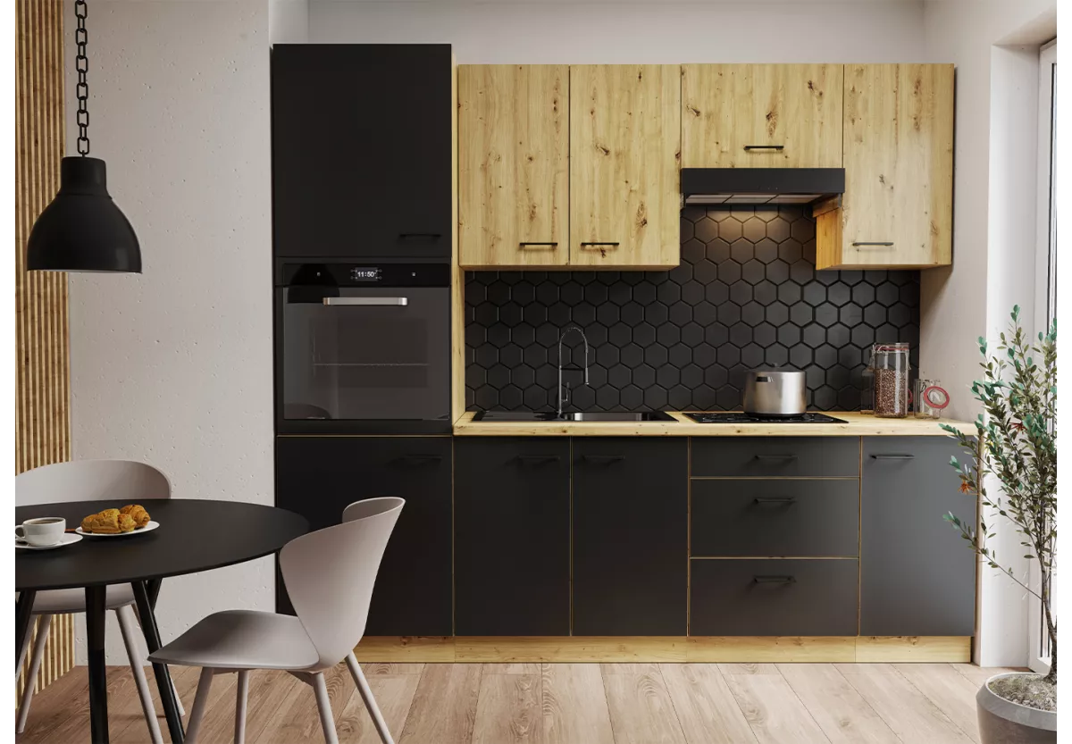 Zestaw mebli kuchennych Namet VII to przemyślana propozycja dla osób, które szukają funkcjonalnej kuchni o wyrazistym, nowoczesnym stylu. Połączenie ciepłego dekoru drewna z kontrastową czernią nadaje wnętrzu elegancji i wyjątkowego charakteru, a ergonomiczny układ szafek ułatwia codzienne użytkowanie.