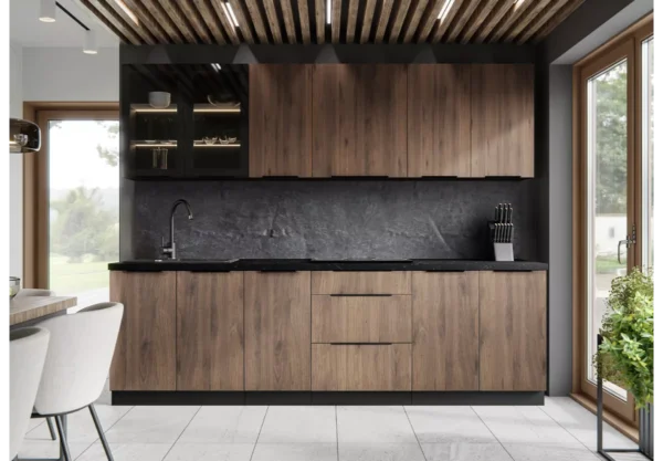 Zestaw mebli kuchennych Zanna II to idealna propozycja dla osób, które oczekują od kuchni nie tylko stylowego wyglądu, ale także wysokiego komfortu codziennego użytkowania. Połączenie eleganckiej czerni z dekorem orzech okapi nadaje wnętrzu wyrazistego charakteru, a solidne materiały i nowoczesne rozwiązania techniczne gwarantują trwałość na lata.