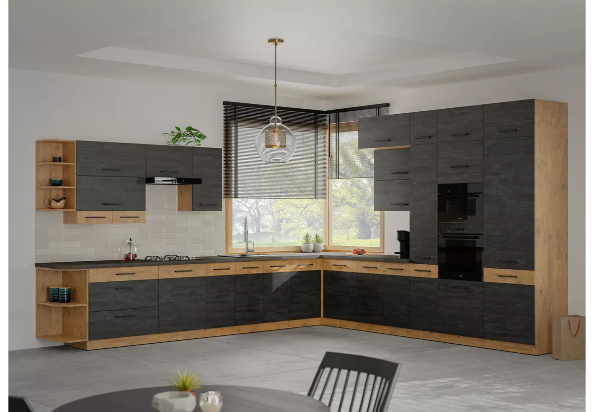 Anafi III to rozbudowany zestaw mebli kuchennych, który łączy nowoczesny minimalizm z ciepłem drewnianych akcentów. Matowe fronty, dekor dąb lancelot oraz czarne metalowe uchwyty tworzą harmonijną i elegancką kompozycję. To propozycja dla osób, które oczekują maksymalnej funkcjonalności, dużej pojemności oraz swobody aranżacyjnej.