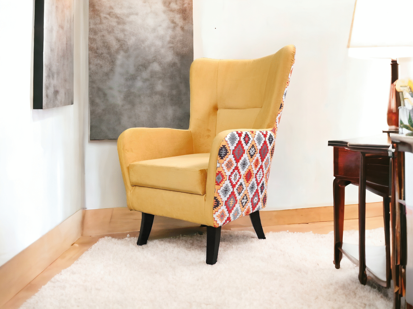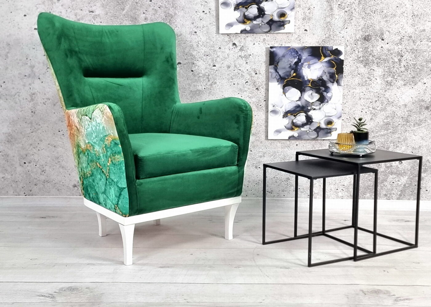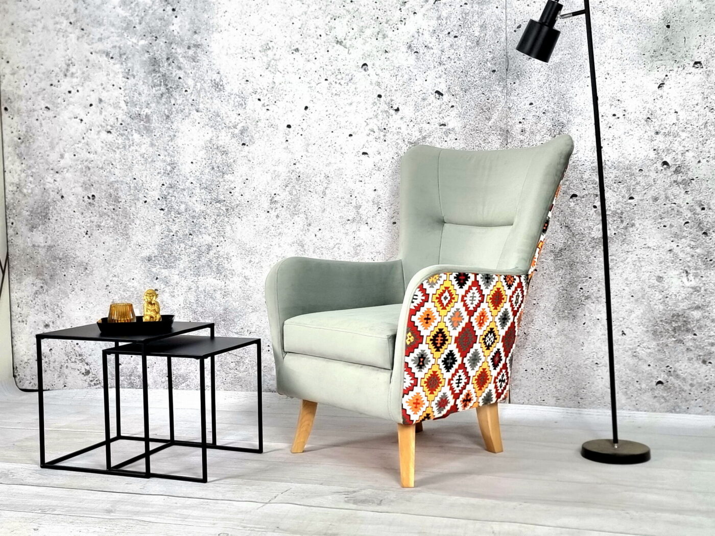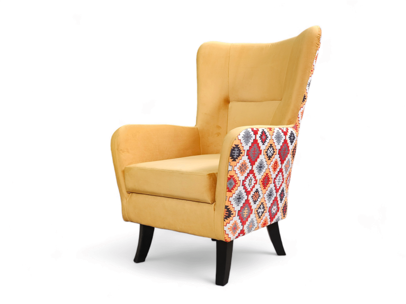 🔸 Nogi: wykonane z litego drewna, o wysokości 19 cm, które nadają fotelowi lekkości i eleganckiego wyglądu.