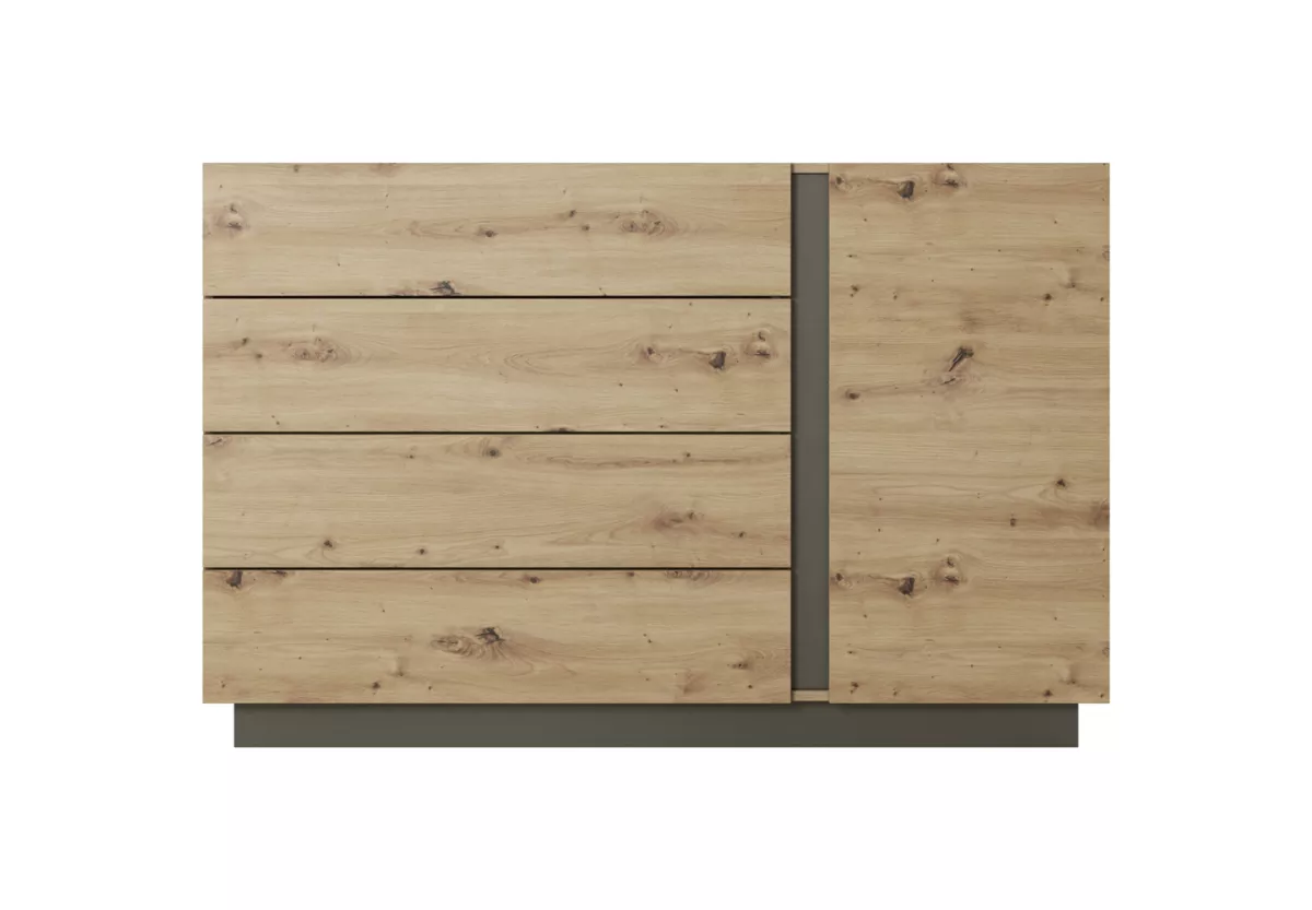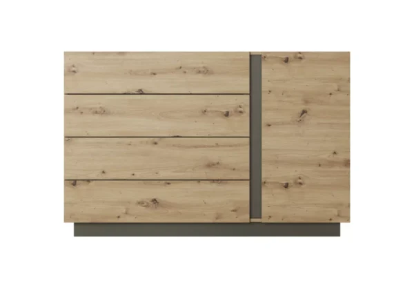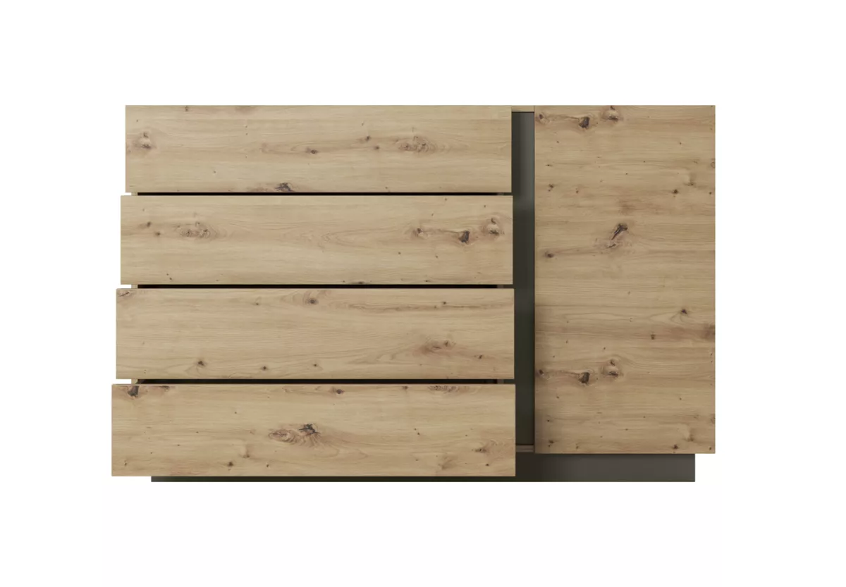 Komoda ARIKO w zestawieniu Dąb Artisan + Grafit to połączenie nowoczesnego designu z funkcjonalnością, która sprawdzi się w codziennym użytkowaniu. Kontrastowe dekory nadają meblowi charakteru, jednocześnie zachowując elegancję i spójność wizualną.