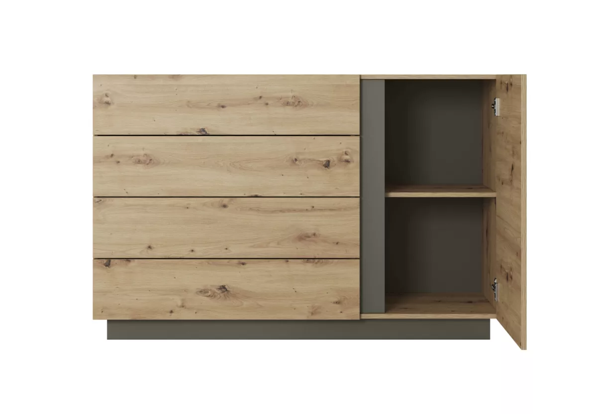 Połączenie grafitowych frontów z dekorem dąb artisan tworzy nowoczesny, a jednocześnie przytulny efekt wizualny. Komoda doskonale odnajdzie się w:
