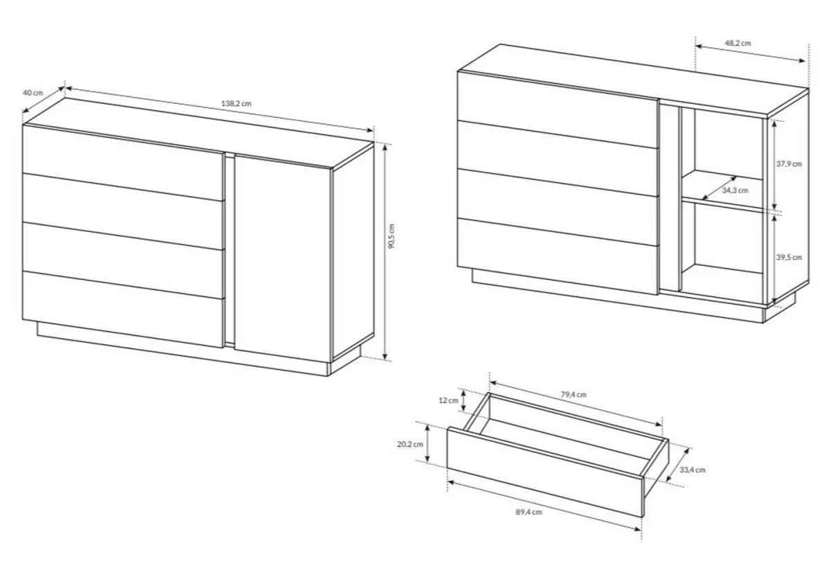 Dzięki takiemu układowi komoda jest funkcjonalna, a jednocześnie zachowuje lekką, nowoczesną bryłę.