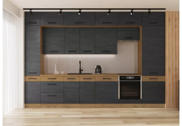 Anafi to rozbudowany zestaw mebli kuchennych, który łączy nowoczesny minimalizm z eleganckim wykończeniem. Matowe fronty, korpus w kolorze dąb lancelot oraz czarne metalowe uchwyty tworzą wyrazistą, a jednocześnie harmonijną kompozycję. To propozycja dla osób, które cenią styl, funkcjonalność i możliwość elastycznej aranżacji przestrzeni.