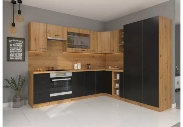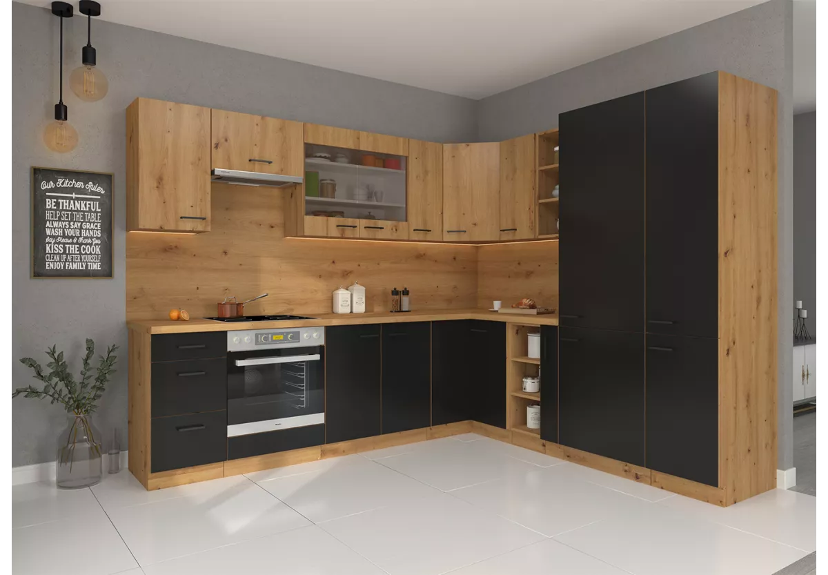 Zestaw mebli kuchennych Namet III to propozycja dla osób, które oczekują od kuchni czegoś więcej niż tylko estetyki. To harmonijne połączenie nowoczesnego designu, trwałych materiałów oraz funkcjonalnych rozwiązań, które realnie podnoszą komfort codziennego użytkowania. Kontrast matowej czerni z dekorem dąb artisan tworzy wyjątkowy klimat, który przyciąga wzrok i nadaje wnętrzu charakteru.