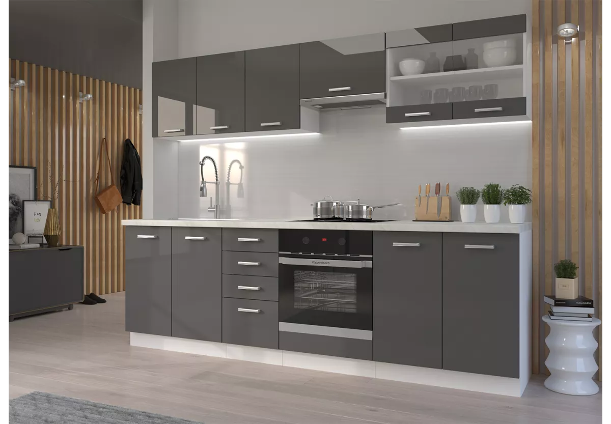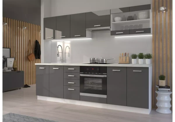 • Fronty w kolorze szarego połysku – nowoczesna elegancja