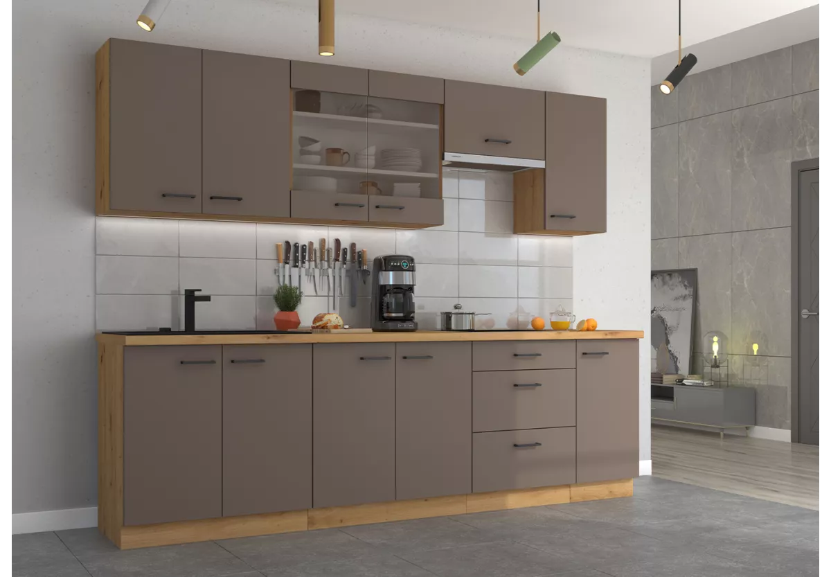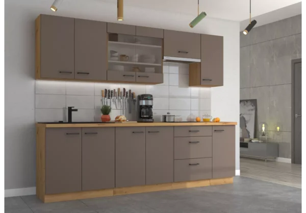 Zestaw mebli kuchennych Tamiza III to propozycja dla osób, które szukają połączenia nowoczesnej estetyki z naturalnym akcentem. Starannie dobrane materiały, przemyślany układ szafek oraz eleganckie wykończenie sprawiają, że kuchnia staje się funkcjonalną i stylową przestrzenią codziennego życia.