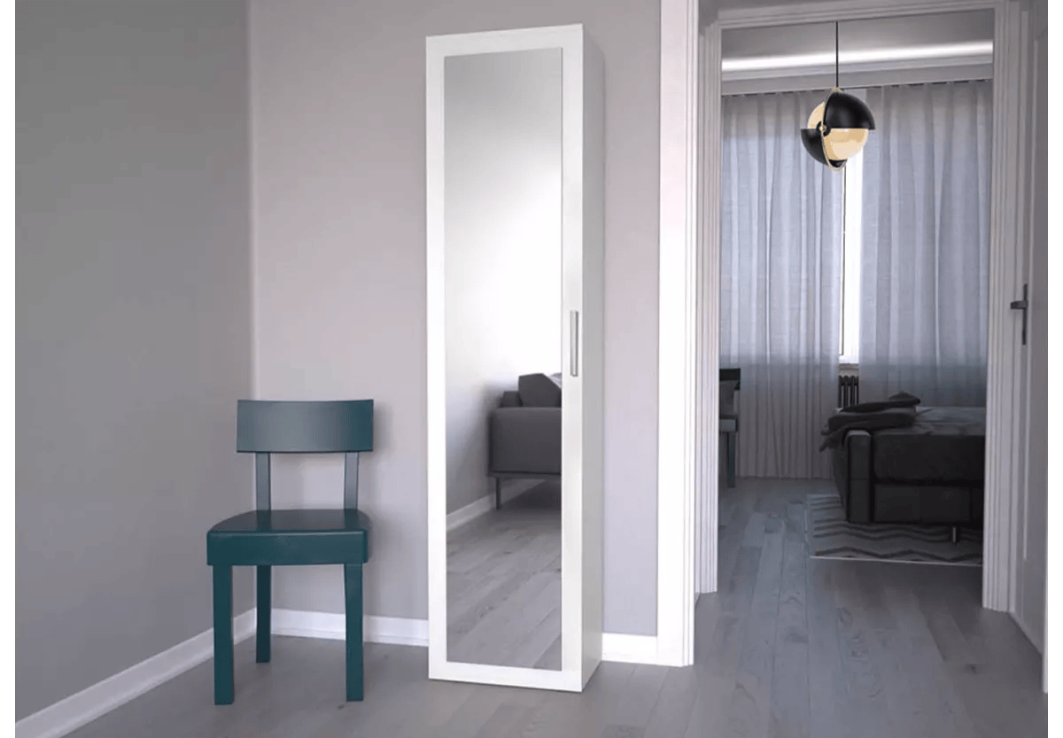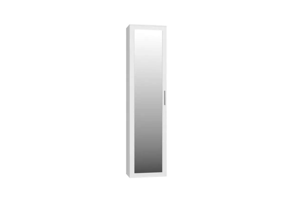 Umieszczone na froncie duże lustro nie tylko podnosi walory estetyczne mebla, ale również optycznie powiększa przestrzeń, co jest szczególnie istotne w wąskich korytarzach.