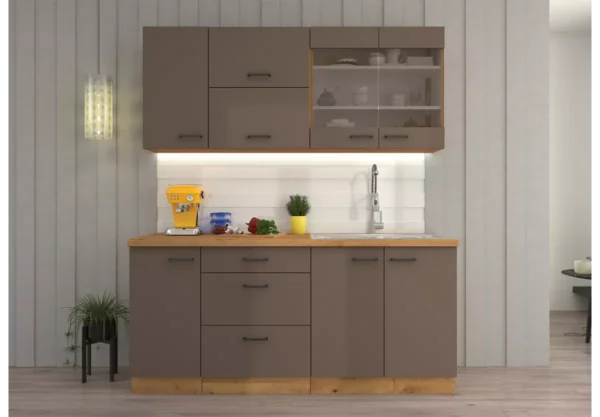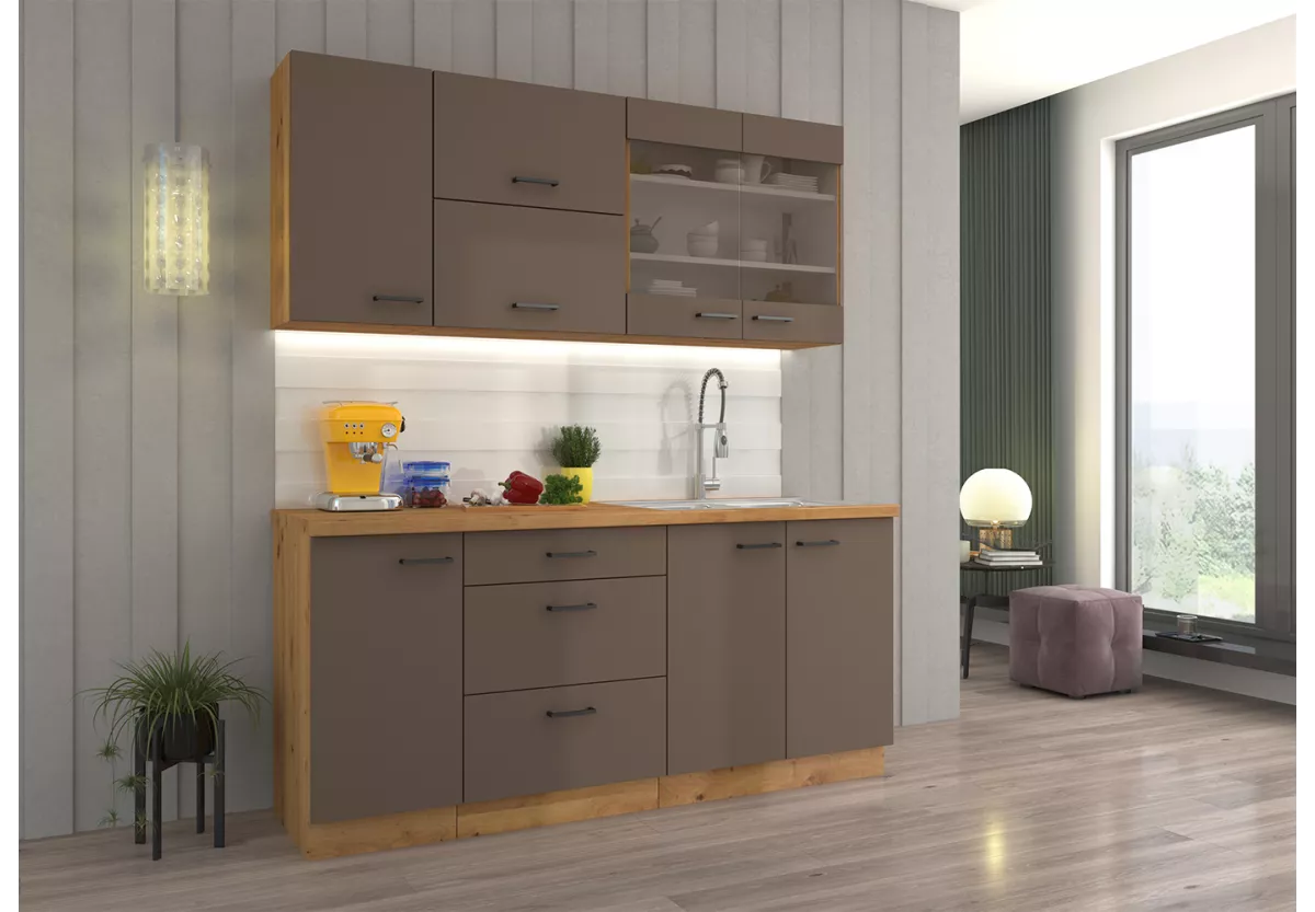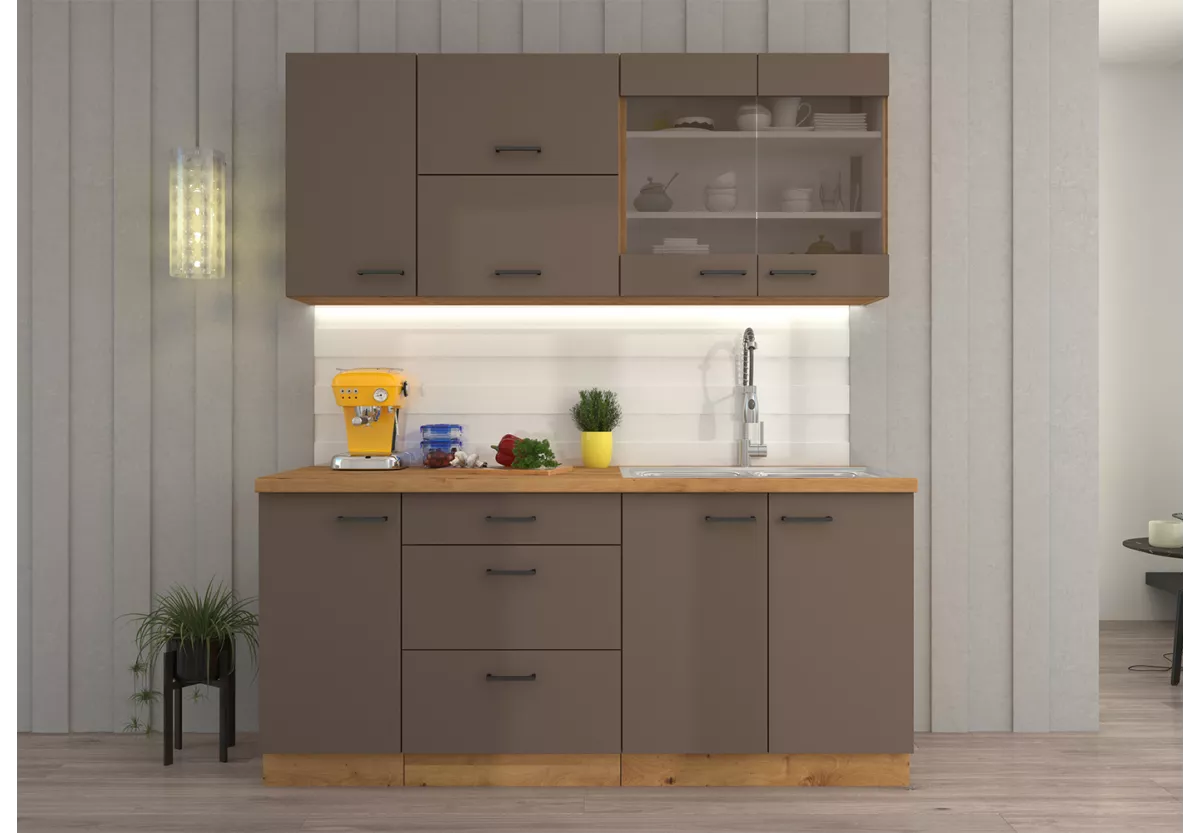 Zestaw mebli kuchennych Tamiza to propozycja dla osób, które cenią solidne wykonanie, praktyczne rozwiązania oraz elegancki wygląd. Stonowana kolorystyka frontów i naturalne akcenty sprawiają, że kuchnia prezentuje się nowocześnie, a jednocześnie ponadczasowo.