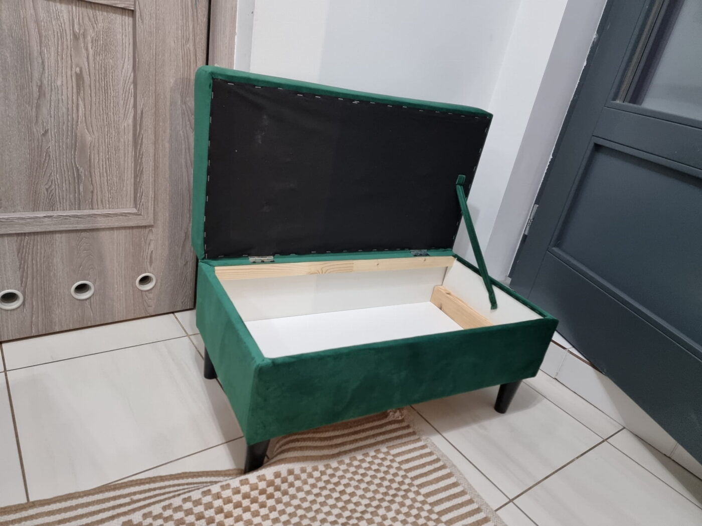Schowek: wyposażona w praktyczny pojemnik, idealny do przechowywania koców, poduszek lub drobiazgów.