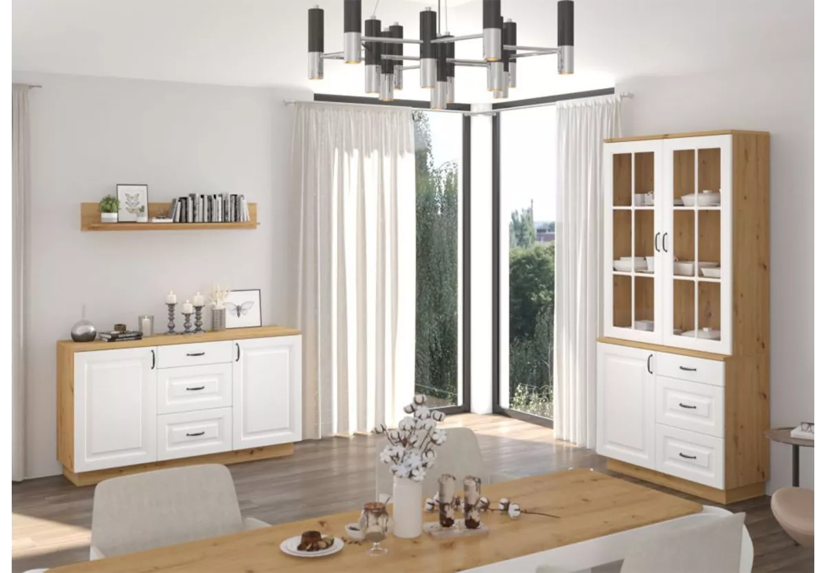 Witryna ALAIA to wyjątkowy mebel, który łączy w sobie klasyczną elegancję z funkcjonalnością dopasowaną do codziennego użytkowania. Jej subtelnie frezowane fronty oraz przeszklone drzwi nadają całości prowansalskiego charakteru, wprowadzając do wnętrza lekkość, styl i ponadczasowy urok.